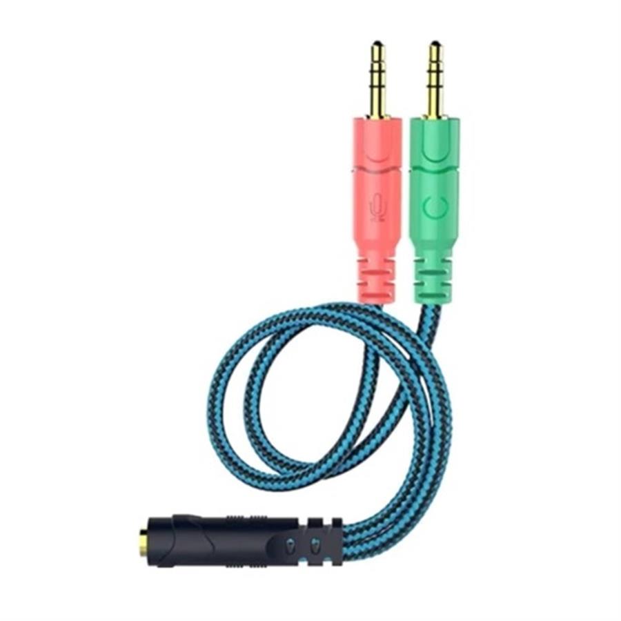 Este cable jack presenta dos conectores macho, verde para auriculares y rojo para micrófono.