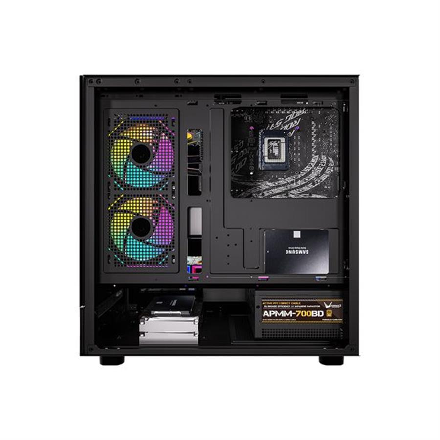 Paneles: Posee dos paneles de vidrio templado, uno en el lateral y otro en el frontal, que permiten exhibir los componentes y la iluminación RGB de los ventiladores.
